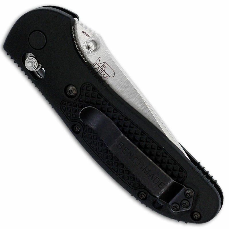 The Griptilian Series in S30V! The 551 Benchmade Griptilian is a workhorse of an EDC, designed by Mel Pardue, that features a 3.45 inch drop point blade made of CPM S30V premium stainless steel, .115 inches thick, with a notched thumb ramp for secure grip, and dual thumb studs for ambidextrous one hand opening. The black GFN (glass filled nylon) handle, 4.62 inches closed, has checkered texturing and notches for secure purchase, sturdy AXIS Lock, and a side to side reversible pocket clip mounted at the butt end. The Benchmade 551 Griptilian Knife has an overall open length of 8.07 inches, and it weighs 3.88 ounces. Proudly made in the USA.