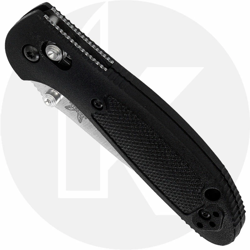 The Griptilian Series in S30V! The 556 Benchmade Mini Griptilian is a compact workhorse of an EDC, designed by Mel Pardue, that features a 2.91 inch drop point blade made of CPM S30V premium stainless steel, .100 inches thick, with a notched thumb ramp for secure grip, and dual thumb studs for ambidextrous one hand opening. The black GFN (glass filled nylon) handle, 3.87 inches closed, has checkered texturing and notches for secure purchase, sturdy AXIS Lock, and a side to side reversible pocket clip mounted at the butt end. The Benchmade 556 Mini Griptilian Knife has an overall open length of 6.78 inches, and it weighs 2.81 ounces. Proudly made in the USA.