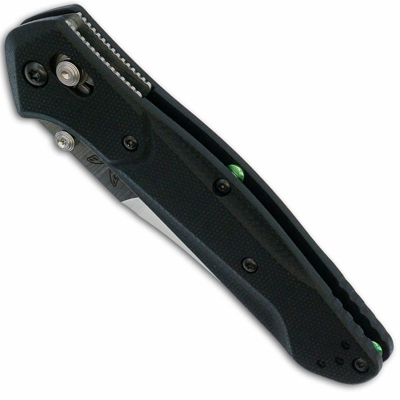 The Benchmade Osborne 940 Knife has been a highly regarded every day carry for many years. This Osborne 940 features a 3.40″ reverse tanto blade made of CPM S30V stainless steel, .115″ thick, with a Rockwell hardness of 58-60, a satin finish with a top swedge, and dual thumb studs for ambidextrous one hand opening. The black G10 handle, 4.47″ closed, has ergonomic milled contouring for secure grip, the ambidextrous AXIS Lock, green anodized barrel spacers for visual interest, and a side to side reversible pocket clip mounted at the butt end. The Benchmade Osborne 940 Knife with G10 handle has an overall open length of 7.87″, and it weighs 2.65 ounces. Proudly made in the USA.