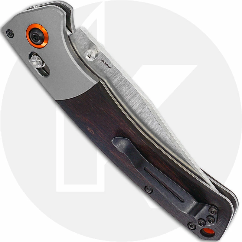 The illustrated Benchmade Knife is the Benchmade Crooked River Knife that features a 4.00″ clip point blade made of CPM S30V stainless steel, .124″ thick, with a Rockwell hardness of 58-60. The blade of this Benchmade Knife has a top swedge and dual thumb studs for ambidextrous one hand opening. The contoured stabilized wood handle, 5.33″ closed, has an anodized aluminum bolster with orange aluminum pivot ring, steel liners and a notched orange G10 back spacer for strength, the ambidextrous AXIS lock and a lanyard hole. A side to side reversible pocket clip is mounted at the butt end of this Benchmade Knife. The Benchmade Crooked River Knife has an overall open length of 9.30″, and it weighs 5.41 ounces. Made in the USA.