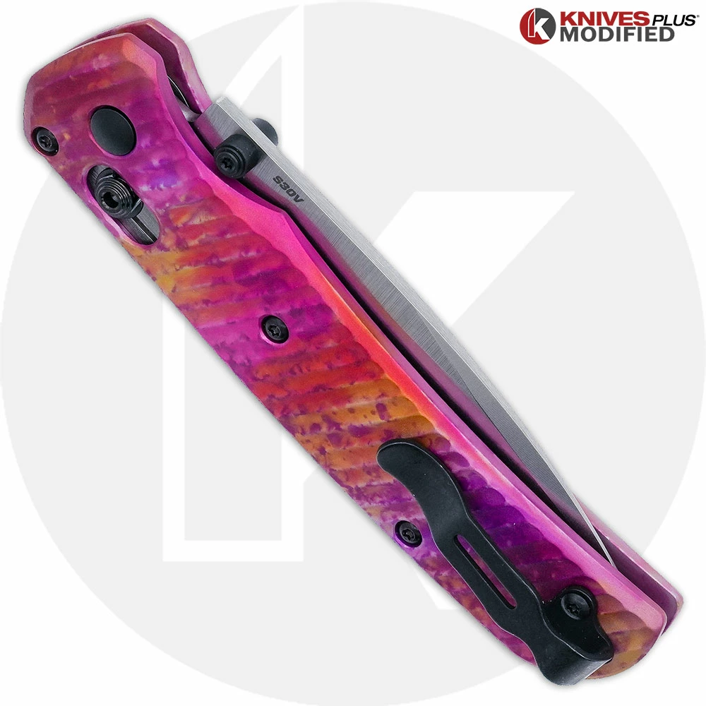 The MODIFIED Benchmade Bugout is a slim, lightweight everyday carry knife that is equally suitable for a pair of dress pants or a backpack. This Bugout features a 3.24″ drop point blade made of CPM S30V stainless steel, .090″ thick, with a Rockwell hardness of 58-60. The blade has a satin finish with a top swedge and dual blue thumb studs for ambidextrous one hand opening. The ergonomic bright blue Grivory handle has been replaced with our exclusive Cerakote color AWT Bugout Archon Custom Anodized Scales. The Bugout has a closed length of 4.22 inches, an ambidextrous AXIS Lock, a large lanyard hole and a side to side reversible discrete carry pocket clip mounted at the butt end. The aluminum thumbstud and standoffs have been replaced with stronger black stainless steel parts. All original parts are included in package. The Benchmade Bugout Knife has an overall open length of 7.46″, and it weighs only 2.4 ounces. Proudly made in the USA.