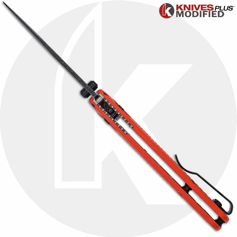 These knives have been modified by the KnivesPlus Team. We take great care in our modifying process to guarantee that they function as intended. Blades have been re-sharpened and are guaranteed to shave. Please note that occasionally, modifications can void the manufacturer warranty.