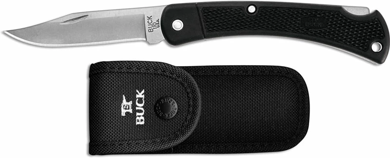 The 0110BKSLT Buck 110 Folding Hunter LT is a lightweight, value priced version of the classic Buck 110 Folding Hunter that features a 3 3/4 inch clip point blade made of 420HC stainless steel, .120 inch thick, with a stonewash finish and a nail nick for opening. The black nylon handle, 4 7/8 inches closed, has texturing for secure grip, a lockback and a lanyard hole. A black heavy duty polyester sheath is included. The Buck 110 Folding Hunter LT has an overall open length of 8 5/8 inches, and it weighs only 3.2 ounces. Proudly made in the USA.