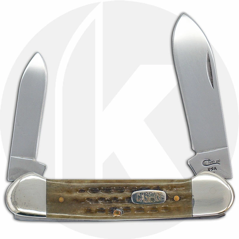 The 00814 Case Pocket Worn Green (62131SS) Canoe Knife features spear and pen blades made of mirror polished Tru-Sharp Surgical steel with nail nicks for opening. The Corn Cob Jig Pocket Worn Green Bone handle, 3 5/8 inches closed, has the Oval Case XX Shield and nickel silver bolsters. The Case Canoe Knife weighs 2.9 ounces. Discontinued item, BNIB; made in the USA in 1997.