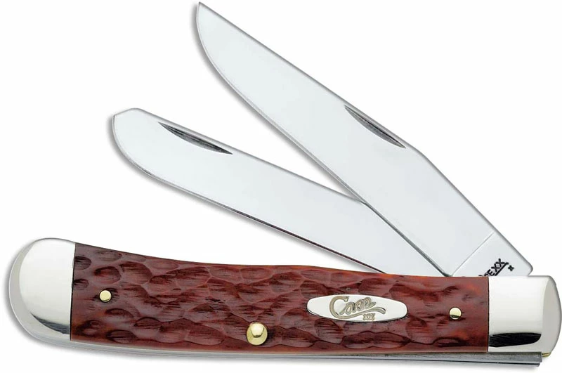 The illustrated Case Knife is the Chestnut Bone CV (6254CV) Case Trapper Knife that features clip and spey blades made of chrome vanadium carbon steel. The jigged Chestnut Bone handle of this Case knife, 4 1/8″ closed, has a nickel silver Case shield and nickel silver bolsters. The Case Trapper Knife with Chestnut Bone handle weighs 4.0 ounces.