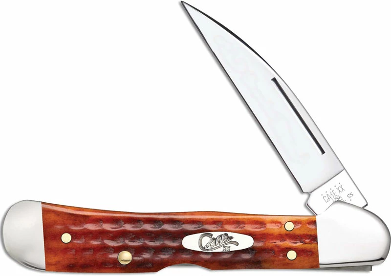The 07397 Case Pocket Worn Harvest Orange Bone (61549WLSS) CopperLock Knife features a locking Wharncliffe blade made of mirror polished Tru-Sharp Surgical steel with a nail nick for opening. The Corn Cob Jig Pocket Worn Harvest Orange Bone handle of this Case knife, 4 1/4 inches closed, has a lockback, the Case Oval Script shield and nickel silver bolsters. The Case CopperLock Knife weighs 2.8 ounces. Made in the USA.
