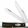 The illustrated Case Knife is the 6.5 BoneStag (6.5265SS) Case Folding Hunter Knife that features clip and skinner blades made of Tru-Sharp surgical stainless steel with nail nicks for opening, and secondary 6.5 tang stamp. The hand flamed BoneStag handle of this Case knife, 5 1/4″ closed, has a nickel silver Case Oval Script Shield and nickel silver bolsters. A genuine leather sheath is included with this Case Knife. The 6.5 BoneStag Case Folding Hunter Knife weighs 7.5 ounces. Made in the USA.