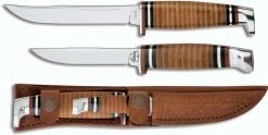 The (3TWINFINNSS) Case Hunting Knife is a Twin Finn Two Knife Set that includes a Case (316-5SS) and (M3FINNSS) Fixed Blade Hunting Knife. The (M3FINNSS) Case Hunting Knife features a 3 1/8″ straight finn blade made of Tru-Sharp surgical steel. The blade of this Case knife has a mirror polished finish. The polished leather handle has decorative red, black and stainless steel spacers located at the stainless steel guard and aluminum butt cap. The (316-5SS) Case Hunting Knife features a 5″ clip point finn blade made of Tru-Sharp surgical steel. The blade of this Case knife has a mirror polished finish. The polished leather handle has decorative red, black and stainless steel spacers located at the stainless steel guard and aluminum butt cap. A genuine leather piggy back sheath that holds both knives is included. The Case Knives Twin Finn Two Knife Set has an overall length of 9 1/2″ and weighs 8.3 ounces.