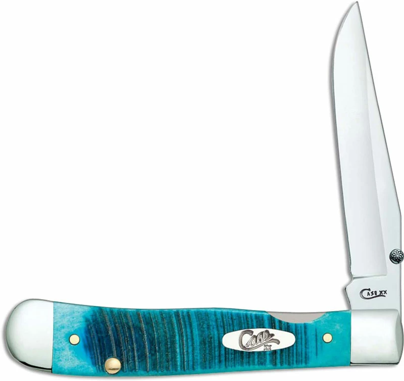 The 25594 Case Caribbean Blue Bone (6154ACSS) Kickstart TrapperLock Knife features a locking clip blade made of Tru-Sharp Surgical steel with a thumb stud and Assist for one hand opening. The Sawcut Jig Caribbean Blue Bone handle of this Case knife, 4 1/8 inches closed, has the Case Oval Script shield, nickel silver bolsters, a liner lock and a pocket clip mounted at the pivot end. The Case Kickstart TrapperLock Knife weighs 3.6 ounces. Made in the USA.