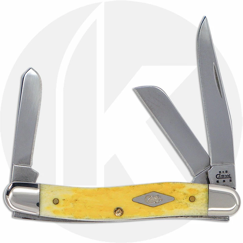 The 07034 Case Tradewinds Collection (6318 SS) Medium Stockman Knife features clip, sheepfoot and spey blades made of mirror polished Tru-Sharp Surgical steel with nail nicks for opening. The Standard Jig Rainforest Yellow Bone handle, 3 5/8 inches closed, has the Case Diamond Shield and nickel silver bolsters. The Case Medium Stockman Knife weighs 2.5 ounces. Discontinued item, BNIB; limited run of 500 pieces, made in the USA in 2004.