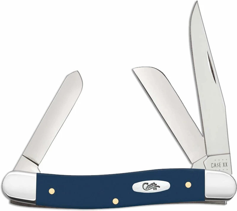 The 23612 Case Navy Blue Synthetic (4318SS) Medium Stockman Knife features mirror polished clip, spey and sheepfoot blades made of Tru-Sharp Surgical Steel with nail nicks for opening. The Smooth Navy Blue Synthetic handle, 3 5/8 inches closed, has the Case Oval Script Shield and nickel silver bolsters. This Case Medium Stockman Knife weighs 2.5 ounces. Made in the USA.