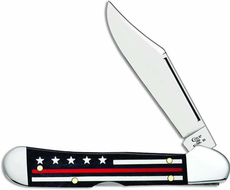 The Case Stripes of Service Series of knives is a tribute to first responders everywhere. The 07312 Case Stars of Service (61749LSS) Mini CopperLock Knife features a locking clip blade made of Tru-Sharp Surgical steel with a nail nick for opening. The Smooth Natural Bone handle of this Case knife, 3 5/8 inches closed, has Black, White and Red Line color wash embellishment, nickel silver bolsters and a lockback. The Case Mini CopperLock Knife weighs 2.0 ounces. Made in the USA.