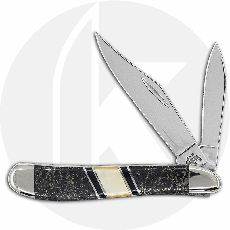 The 06403 Case Exotic Apache Gold (EX220SS) Peanut Knife features clip and pen blades made of mirror polished Tru-Sharp Surgical steel with nail nicks for opening. The eye catching Apache Gold handle, 2 7/8 inches closed, has Gold Mother of Pearl, black stone and nickel silver inlays, and nickel silver bolsters. The Case Peanut Knife weighs 1.2 ounces. Discontinued item, BNIB; made in the USA in 2004.