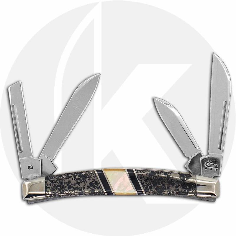The 06405 Case Exotic Apache Gold (EX468SS) Small Congress Knife features sheepfoot, spear, pen and coping blades made of mirror polished Tru-Sharp Surgical steel, with nail nicks for opening. The eye catching Apache Gold handle, 3 1/8 inches closed, has Gold Mother of Pearl, black stone and nickel silver inlays, and nickel silver bolsters. The Case Small Congress Knife weighs 1.6 ounces. Discontinued item, BNIB; made in the USA in 2004.
