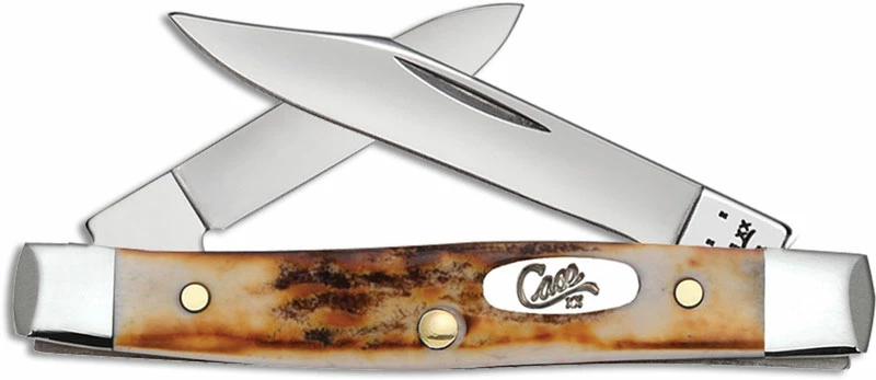 The illustrated Case Knife is the Genuine Stag (5233SS) Case Small Pen Knife that features clip and pen blades made of Tru-Sharp surgical steel with nail nicks for opening. The genuine Stag handle of this Case knife, 2 5/8″ closed, has a nickel silver Case Oval Script shield and nickel silver bolsters. The Case Small Pen Knife with genuine Stag handle weighs .9 ounces.