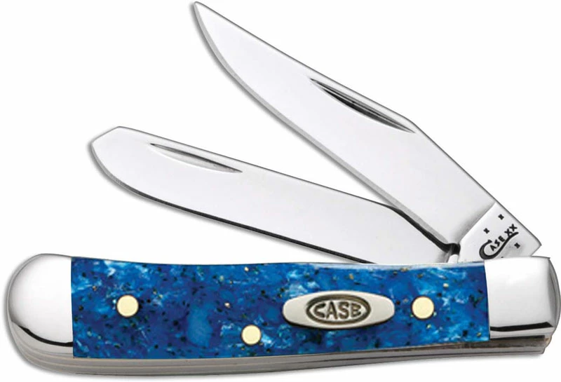 The illustrated Case Knife is the Blue Sparkle Kirinite (102154SS) Case Tiny Trapper Knife that features clip and spey blades made of Tru Sharp Surgical steel with nail nicks for opening. The Blue Sparkle Kirinite handle of this Case knife, 2 3/8″ closed, has a nickel silver Case Oval Shield and nickel silver bolsters. The Case Tiny Trapper Knife with Blue Sparkle Kirinite handle weighs 1 ounce. Made in the USA.