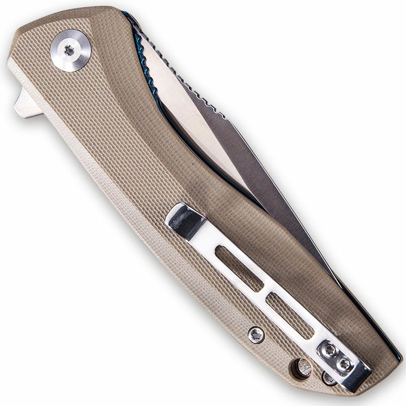 The C801B CIVIVI Baklash is a high quality value price EDC produced by CIVIVI, a subsidiary of WE Knife Company, that features a 3.5 inch drop point blade made of 9Cr18MoV stainless steel, .12 inches thick, with a Rockwell hardness of 58-60, a hollow grind, swedged spine, satin finish, notched thumb rest for secure grip, and a flipper for ambidextrous one hand opening. The tan G10 handle, 4.6 inches closed, has chamfered edges for comfort, pivot with stainless steel ball bearing support for smooth opening, stainless steel liners for strength (in contrasting blue for visual interest), sturdy liner lock, G10 back spacer with lanyard hole, and a side to side reversible deep carry stainless steel pocket clip mounted at the butt end. This WE CIVIVI Baklash Knife has an overall open length of 8.10 inches, and it weighs 3.88 ounces. Made in China.